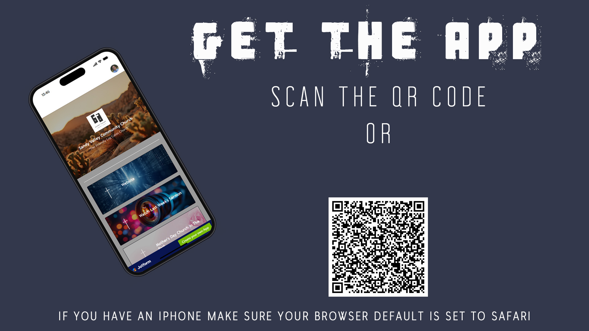 and a short devotional.Instant access to your churchGet the appScan the QR code and follow the instructions. For IOS (iPhone) users make sure your default browser is set to Safari to be able to add app icon to your home screen.Click HerePerhaps you struggle with personal evangelism or have questions regarding reaching others with the Gospel. If so, then this class is for you.EVANGELISMSUNDAY MORNINGS 9:30 AM